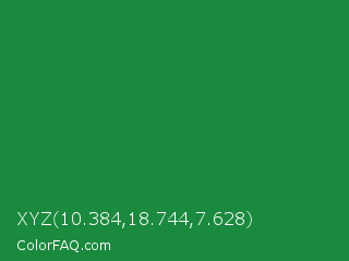 XYZ 10.384,18.744,7.628 Color is a normal green color and the nearest color is Salem #097f4b. Hex code #1a8a3e and RGB value is rgb(26,138,62). In RGB color space, this color is composed of 10% red, 54% green, 24% blue, In CMYK color space, this color is composed of 81% cyan, 0% magenta, 55% yellow , 46% black , In HSL color space, this color has a hue angle of 139° , 68% saturation and 32% lightness.