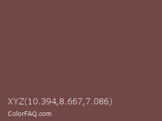 XYZ 10.394,8.667,7.086 Color is a normal red color and the nearest color is Roast Coffee #704241. Hex code #724847 and RGB value is rgb(114,72,71). In RGB color space, this color is composed of 45% red, 28% green, 28% blue, In CMYK color space, this color is composed of 0% cyan, 37% magenta, 38% yellow , 55% black , In HSL color space, this color has a hue angle of 1° , 23% saturation and 36% lightness.