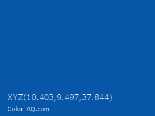 XYZ 10.403,9.497,37.844 Color is a normal blue color and the nearest color is Endeavour #0056a7. Hex code #0856a7 and RGB value is rgb(8,86,167). In RGB color space, this color is composed of 3% red, 34% green, 65% blue, In CMYK color space, this color is composed of 95% cyan, 49% magenta, 0% yellow , 35% black , In HSL color space, this color has a hue angle of 211° , 91% saturation and 34% lightness.