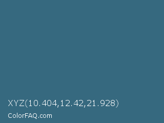 XYZ 10.404,12.42,21.928 Color is a normal blue color and the nearest color is Ming #36747d. Hex code #36697f and RGB value is rgb(54,105,127). In RGB color space, this color is composed of 21% red, 41% green, 50% blue, In CMYK color space, this color is composed of 57% cyan, 17% magenta, 0% yellow , 50% black , In HSL color space, this color has a hue angle of 198° , 40% saturation and 35% lightness.