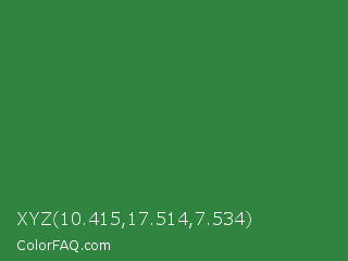 XYZ 10.415,17.514,7.534 Color is a normal green color and the nearest color is Goblin #3d7d52. Hex code #31843f and RGB value is rgb(49,132,63). In RGB color space, this color is composed of 19% red, 52% green, 25% blue, In CMYK color space, this color is composed of 63% cyan, 0% magenta, 52% yellow , 48% black , In HSL color space, this color has a hue angle of 130° , 46% saturation and 35% lightness.