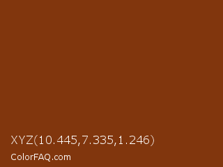 XYZ 10.445,7.335,1.246 Color is a dark orange color and the nearest color is Copper Canyon #7e3a15. Hex code #81360d and RGB value is rgb(129,54,13). In RGB color space, this color is composed of 51% red, 21% green, 5% blue, In CMYK color space, this color is composed of 0% cyan, 58% magenta, 90% yellow , 49% black , In HSL color space, this color has a hue angle of 21° , 82% saturation and 28% lightness.