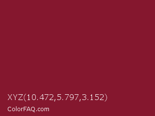 XYZ 10.472,5.797,3.152 Color is a normal red color and the nearest color is Antique Ruby #841b2d. Hex code #85172e and RGB value is rgb(133,23,46). In RGB color space, this color is composed of 52% red, 9% green, 18% blue, In CMYK color space, this color is composed of 0% cyan, 83% magenta, 65% yellow , 48% black , In HSL color space, this color has a hue angle of 347° , 71% saturation and 31% lightness.