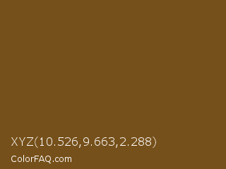 XYZ 10.526,9.663,2.288 Color is a dark orange color and the nearest color is Raw Umber #734a12. Hex code #76501a and RGB value is rgb(118,80,26). In RGB color space, this color is composed of 46% red, 31% green, 10% blue, In CMYK color space, this color is composed of 0% cyan, 32% magenta, 78% yellow , 54% black , In HSL color space, this color has a hue angle of 35° , 64% saturation and 28% lightness.