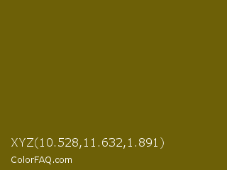XYZ 10.528,11.632,1.891 Color is a dark yellow color and the nearest color is Spicy Mustard #74640d. Hex code #6d6007 and RGB value is rgb(109,96,7). In RGB color space, this color is composed of 43% red, 38% green, 3% blue, In CMYK color space, this color is composed of 0% cyan, 12% magenta, 94% yellow , 57% black , In HSL color space, this color has a hue angle of 52° , 88% saturation and 23% lightness.