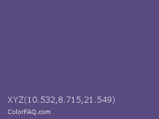 XYZ 10.532,8.715,21.549 Color is a normal indigo color and the nearest color is Cyber Grape #58427c. Hex code #594b80 and RGB value is rgb(89,75,128). In RGB color space, this color is composed of 35% red, 29% green, 50% blue, In CMYK color space, this color is composed of 30% cyan, 41% magenta, 0% yellow , 50% black , In HSL color space, this color has a hue angle of 256° , 26% saturation and 40% lightness.