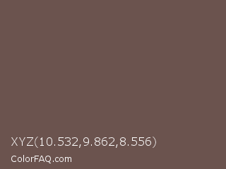 XYZ 10.532,9.862,8.556 Color is a normal red color and the nearest color is Ferra #704f50. Hex code #6b534e and RGB value is rgb(107,83,78). In RGB color space, this color is composed of 42% red, 33% green, 31% blue, In CMYK color space, this color is composed of 0% cyan, 22% magenta, 27% yellow , 58% black , In HSL color space, this color has a hue angle of 10° , 16% saturation and 36% lightness.