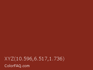 XYZ 10.596,6.517,1.736 Color is a normal red color and the nearest color is Kobe #882d17. Hex code #85271b and RGB value is rgb(133,39,27). In RGB color space, this color is composed of 52% red, 15% green, 11% blue, In CMYK color space, this color is composed of 0% cyan, 71% magenta, 80% yellow , 48% black , In HSL color space, this color has a hue angle of 7° , 66% saturation and 31% lightness.