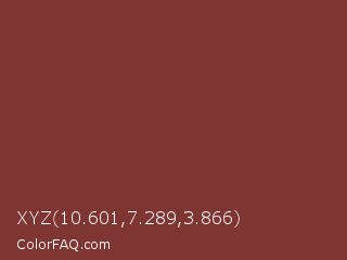 XYZ 10.601,7.289,3.866 Color is a normal red color and the nearest color is Lotus #863c3c. Hex code #7f3532 and RGB value is rgb(127,53,50). In RGB color space, this color is composed of 50% red, 21% green, 20% blue, In CMYK color space, this color is composed of 0% cyan, 58% magenta, 61% yellow , 50% black , In HSL color space, this color has a hue angle of 2° , 44% saturation and 35% lightness.