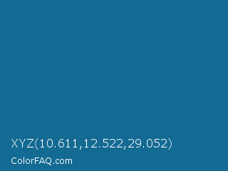 XYZ 10.611,12.522,29.052 Color is a normal blue color and the nearest color is Matisse #1b659d. Hex code #136a92 and RGB value is rgb(19,106,146). In RGB color space, this color is composed of 7% red, 42% green, 57% blue, In CMYK color space, this color is composed of 87% cyan, 27% magenta, 0% yellow , 43% black , In HSL color space, this color has a hue angle of 199° , 77% saturation and 32% lightness.