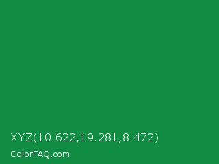 XYZ 10.622,19.281,8.472 Color is a normal green color and the nearest color is Salem #097f4b. Hex code #118c43 and RGB value is rgb(17,140,67). In RGB color space, this color is composed of 7% red, 55% green, 26% blue, In CMYK color space, this color is composed of 88% cyan, 0% magenta, 52% yellow , 45% black , In HSL color space, this color has a hue angle of 144° , 78% saturation and 31% lightness.