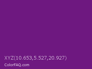 XYZ 10.653,5.527,20.927 Color is a dark purple color and the nearest color is Seance #731e8f. Hex code #6e1880 and RGB value is rgb(110,24,128). In RGB color space, this color is composed of 43% red, 9% green, 50% blue, In CMYK color space, this color is composed of 14% cyan, 81% magenta, 0% yellow , 50% black , In HSL color space, this color has a hue angle of 290° , 68% saturation and 30% lightness.