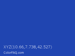 XYZ 10.66,7.738,42.527 Color is a normal blue color and the nearest color is Denim Blue #2243b6. Hex code #2045b1 and RGB value is rgb(32,69,177). In RGB color space, this color is composed of 13% red, 27% green, 69% blue, In CMYK color space, this color is composed of 82% cyan, 61% magenta, 0% yellow , 31% black , In HSL color space, this color has a hue angle of 225° , 69% saturation and 41% lightness.