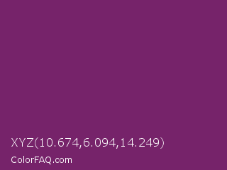 XYZ 10.674,6.094,14.249 Color is a dark magenta color and the nearest color is Midnight #702670. Hex code #76236a and RGB value is rgb(118,35,106). In RGB color space, this color is composed of 46% red, 14% green, 42% blue, In CMYK color space, this color is composed of 0% cyan, 70% magenta, 10% yellow , 54% black , In HSL color space, this color has a hue angle of 309° , 54% saturation and 30% lightness.