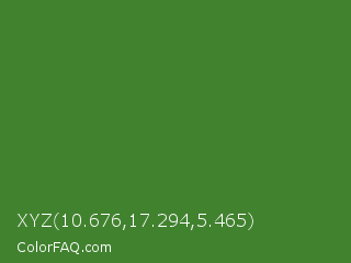 XYZ 10.676,17.294,5.465 Color is a normal green color and the nearest color is Sap Green #507d2a. Hex code #41822f and RGB value is rgb(65,130,47). In RGB color space, this color is composed of 25% red, 51% green, 18% blue, In CMYK color space, this color is composed of 50% cyan, 0% magenta, 64% yellow , 49% black , In HSL color space, this color has a hue angle of 107° , 47% saturation and 35% lightness.