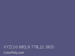 XYZ 10.683,9.778,21.063 Color is a normal indigo color and the nearest color is Purple Navy #4e5180. Hex code #55547e and RGB value is rgb(85,84,126). In RGB color space, this color is composed of 33% red, 33% green, 49% blue, In CMYK color space, this color is composed of 33% cyan, 33% magenta, 0% yellow , 51% black , In HSL color space, this color has a hue angle of 241° , 20% saturation and 41% lightness.