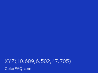 XYZ 10.689,6.502,47.705 Color is a normal blue color and the nearest color is Persian Blue #1c39bb. Hex code #1737bb and RGB value is rgb(23,55,187). In RGB color space, this color is composed of 9% red, 22% green, 73% blue, In CMYK color space, this color is composed of 88% cyan, 71% magenta, 0% yellow , 27% black , In HSL color space, this color has a hue angle of 228° , 78% saturation and 41% lightness.