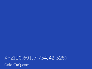 XYZ 10.691,7.754,42.528 Color is a normal blue color and the nearest color is Denim Blue #2243b6. Hex code #2145b1 and RGB value is rgb(33,69,177). In RGB color space, this color is composed of 13% red, 27% green, 69% blue, In CMYK color space, this color is composed of 81% cyan, 61% magenta, 0% yellow , 31% black , In HSL color space, this color has a hue angle of 225° , 69% saturation and 41% lightness.