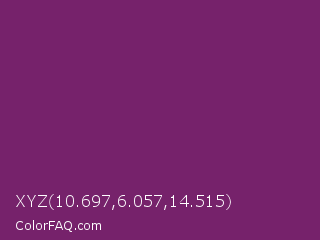 XYZ 10.697,6.057,14.515 Color is a dark magenta color and the nearest color is Midnight #702670. Hex code #76226b and RGB value is rgb(118,34,107). In RGB color space, this color is composed of 46% red, 13% green, 42% blue, In CMYK color space, this color is composed of 0% cyan, 71% magenta, 9% yellow , 54% black , In HSL color space, this color has a hue angle of 308° , 55% saturation and 30% lightness.
