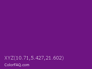 XYZ 10.71,5.427,21.602 Color is a dark purple color and the nearest color is Seance #731e8f. Hex code #6e1482 and RGB value is rgb(110,20,130). In RGB color space, this color is composed of 43% red, 8% green, 51% blue, In CMYK color space, this color is composed of 15% cyan, 85% magenta, 0% yellow , 49% black , In HSL color space, this color has a hue angle of 289° , 73% saturation and 29% lightness.