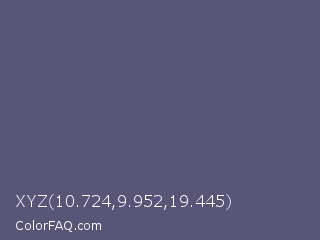 XYZ 10.724,9.952,19.445 Color is a normal indigo color and the nearest color is Comet #5c5d75. Hex code #585579 and RGB value is rgb(88,85,121). In RGB color space, this color is composed of 35% red, 33% green, 47% blue, In CMYK color space, this color is composed of 27% cyan, 30% magenta, 0% yellow , 53% black , In HSL color space, this color has a hue angle of 245° , 17% saturation and 40% lightness.