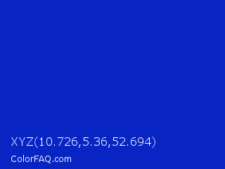 XYZ 10.726,5.36,52.694 Color is a normal blue color and the nearest color is Persian Blue #1c39bb. Hex code #0825c4 and RGB value is rgb(8,37,196). In RGB color space, this color is composed of 3% red, 15% green, 77% blue, In CMYK color space, this color is composed of 96% cyan, 81% magenta, 0% yellow , 23% black , In HSL color space, this color has a hue angle of 231° , 92% saturation and 40% lightness.