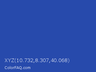 XYZ 10.732,8.307,40.068 Color is a normal blue color and the nearest color is Violet Blue #324ab2. Hex code #274aac and RGB value is rgb(39,74,172). In RGB color space, this color is composed of 15% red, 29% green, 67% blue, In CMYK color space, this color is composed of 77% cyan, 57% magenta, 0% yellow , 33% black , In HSL color space, this color has a hue angle of 224° , 63% saturation and 41% lightness.