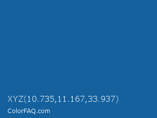 XYZ 10.735,11.167,33.937 Color is a normal blue color and the nearest color is Matisse #1b659d. Hex code #14619e and RGB value is rgb(20,97,158). In RGB color space, this color is composed of 8% red, 38% green, 62% blue, In CMYK color space, this color is composed of 87% cyan, 39% magenta, 0% yellow , 38% black , In HSL color space, this color has a hue angle of 207° , 78% saturation and 35% lightness.