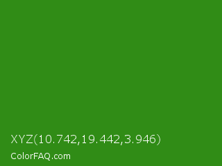 XYZ 10.742,19.442,3.946 Color is a normal green color and the nearest color is La Palma #368716. Hex code #308c16 and RGB value is rgb(48,140,22). In RGB color space, this color is composed of 19% red, 55% green, 9% blue, In CMYK color space, this color is composed of 66% cyan, 0% magenta, 84% yellow , 45% black , In HSL color space, this color has a hue angle of 107° , 73% saturation and 32% lightness.