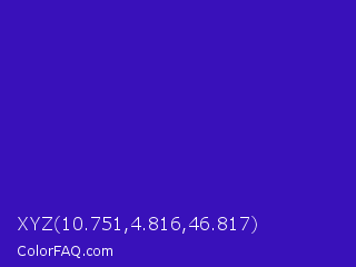 XYZ 10.751,4.816,46.817 Color is a normal indigo color and the nearest color is Interdimensional Blue #360ccc. Hex code #3911ba and RGB value is rgb(57,17,186). In RGB color space, this color is composed of 22% red, 7% green, 73% blue, In CMYK color space, this color is composed of 69% cyan, 91% magenta, 0% yellow , 27% black , In HSL color space, this color has a hue angle of 254° , 83% saturation and 40% lightness.