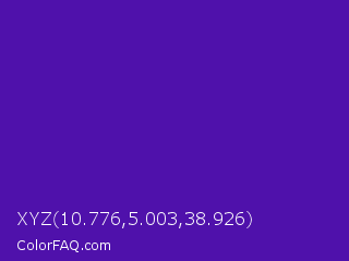 XYZ 10.776,5.003,38.926 Color is a normal violet color and the nearest color is Daisy Bush #4f2398. Hex code #4f11ab and RGB value is rgb(79,17,171). In RGB color space, this color is composed of 31% red, 7% green, 67% blue, In CMYK color space, this color is composed of 54% cyan, 90% magenta, 0% yellow , 33% black , In HSL color space, this color has a hue angle of 264° , 82% saturation and 37% lightness.