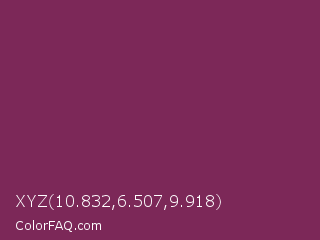 XYZ 10.832,6.507,9.918 Color is a normal magenta color and the nearest color is Dark Raspberry #872657. Hex code #7c2858 and RGB value is rgb(124,40,88). In RGB color space, this color is composed of 49% red, 16% green, 35% blue, In CMYK color space, this color is composed of 0% cyan, 68% magenta, 29% yellow , 51% black , In HSL color space, this color has a hue angle of 326° , 51% saturation and 32% lightness.