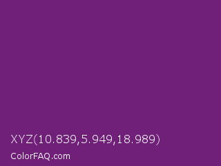 XYZ 10.839,5.949,18.989 Color is a dark magenta color and the nearest color is Midnight #702670. Hex code #71207a and RGB value is rgb(113,32,122). In RGB color space, this color is composed of 44% red, 13% green, 48% blue, In CMYK color space, this color is composed of 7% cyan, 74% magenta, 0% yellow , 52% black , In HSL color space, this color has a hue angle of 294° , 58% saturation and 30% lightness.