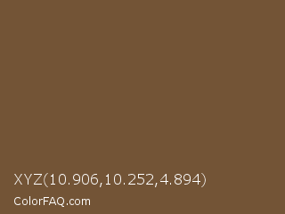 XYZ 10.906,10.252,4.894 Color is a normal orange color and the nearest color is Tuscan Brown Coffee #6f4e37. Hex code #735436 and RGB value is rgb(115,84,54). In RGB color space, this color is composed of 45% red, 33% green, 21% blue, In CMYK color space, this color is composed of 0% cyan, 27% magenta, 53% yellow , 55% black , In HSL color space, this color has a hue angle of 30° , 36% saturation and 33% lightness.