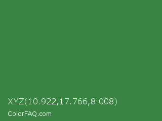 XYZ 10.922,17.766,8.008 Color is a normal green color and the nearest color is Goblin #3d7d52. Hex code #398442 and RGB value is rgb(57,132,66). In RGB color space, this color is composed of 22% red, 52% green, 26% blue, In CMYK color space, this color is composed of 57% cyan, 0% magenta, 50% yellow , 48% black , In HSL color space, this color has a hue angle of 127° , 40% saturation and 37% lightness.
