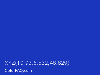 XYZ 10.93,6.532,48.829 Color is a normal blue color and the nearest color is Persian Blue #1c39bb. Hex code #1a36bd and RGB value is rgb(26,54,189). In RGB color space, this color is composed of 10% red, 21% green, 74% blue, In CMYK color space, this color is composed of 86% cyan, 71% magenta, 0% yellow , 26% black , In HSL color space, this color has a hue angle of 230° , 76% saturation and 42% lightness.