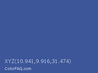 XYZ 10.941,9.916,31.474 Color is a normal blue color and the nearest color is Azure #315ba1. Hex code #3c5699 and RGB value is rgb(60,86,153). In RGB color space, this color is composed of 24% red, 34% green, 60% blue, In CMYK color space, this color is composed of 61% cyan, 44% magenta, 0% yellow , 40% black , In HSL color space, this color has a hue angle of 223° , 44% saturation and 42% lightness.