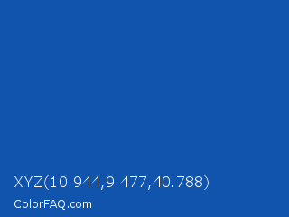 XYZ 10.944,9.477,40.788 Color is a normal blue color and the nearest color is Tory Blue #1450aa. Hex code #1154ad and RGB value is rgb(17,84,173). In RGB color space, this color is composed of 7% red, 33% green, 68% blue, In CMYK color space, this color is composed of 90% cyan, 51% magenta, 0% yellow , 32% black , In HSL color space, this color has a hue angle of 214° , 82% saturation and 37% lightness.