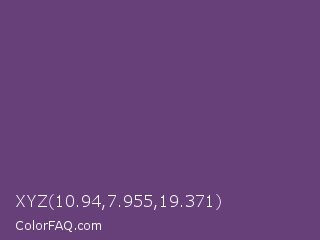 XYZ 10.94,7.955,19.371 Color is a normal purple color and the nearest color is Cyber Grape #58427c. Hex code #67407a and RGB value is rgb(103,64,122). In RGB color space, this color is composed of 40% red, 25% green, 48% blue, In CMYK color space, this color is composed of 16% cyan, 48% magenta, 0% yellow , 52% black , In HSL color space, this color has a hue angle of 280° , 31% saturation and 36% lightness.