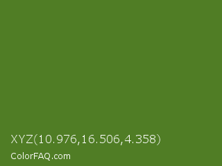XYZ 10.976,16.506,4.358 Color is a normal green color and the nearest color is Sap Green #507d2a. Hex code #507d25 and RGB value is rgb(80,125,37). In RGB color space, this color is composed of 31% red, 49% green, 15% blue, In CMYK color space, this color is composed of 36% cyan, 0% magenta, 70% yellow , 51% black , In HSL color space, this color has a hue angle of 91° , 54% saturation and 32% lightness.