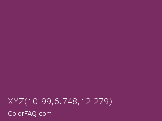 XYZ 10.99,6.748,12.279 Color is a normal magenta color and the nearest color is Byzantium #702963. Hex code #792c62 and RGB value is rgb(121,44,98). In RGB color space, this color is composed of 47% red, 17% green, 38% blue, In CMYK color space, this color is composed of 0% cyan, 64% magenta, 19% yellow , 53% black , In HSL color space, this color has a hue angle of 318° , 47% saturation and 32% lightness.