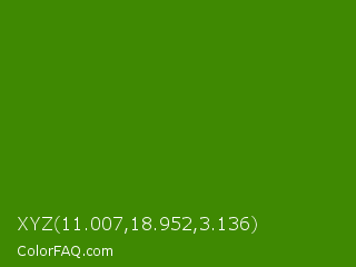 XYZ 11.007,18.952,3.136 Color is a dark green color and the nearest color is La Palma #368716. Hex code #3f8902 and RGB value is rgb(63,137,2). In RGB color space, this color is composed of 25% red, 54% green, 1% blue, In CMYK color space, this color is composed of 54% cyan, 0% magenta, 99% yellow , 46% black , In HSL color space, this color has a hue angle of 93° , 97% saturation and 27% lightness.