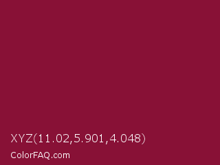 XYZ 11.02,5.901,4.048 Color is a dark rose color and the nearest color is Claret #7f1734. Hex code #881136 and RGB value is rgb(136,17,54). In RGB color space, this color is composed of 53% red, 7% green, 21% blue, In CMYK color space, this color is composed of 0% cyan, 88% magenta, 60% yellow , 47% black , In HSL color space, this color has a hue angle of 341° , 78% saturation and 30% lightness.