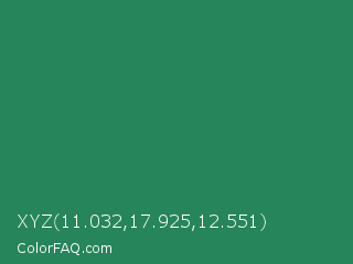 XYZ 11.032,17.925,12.551 Color is a normal green color and the nearest color is Eucalyptus #278a5b. Hex code #26855a and RGB value is rgb(38,133,90). In RGB color space, this color is composed of 15% red, 52% green, 35% blue, In CMYK color space, this color is composed of 71% cyan, 0% magenta, 32% yellow , 48% black , In HSL color space, this color has a hue angle of 153° , 56% saturation and 34% lightness.