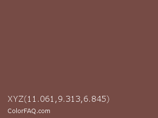 XYZ 11.061,9.313,6.845 Color is a normal red color and the nearest color is Tuscan Red #7c4848. Hex code #764b45 and RGB value is rgb(118,75,69). In RGB color space, this color is composed of 46% red, 29% green, 27% blue, In CMYK color space, this color is composed of 0% cyan, 36% magenta, 42% yellow , 54% black , In HSL color space, this color has a hue angle of 7° , 26% saturation and 37% lightness.