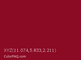 XYZ 11.074,5.833,2.211 Color is a dark red color and the nearest color is Monarch #8b0723. Hex code #8b0a24 and RGB value is rgb(139,10,36). In RGB color space, this color is composed of 55% red, 4% green, 14% blue, In CMYK color space, this color is composed of 0% cyan, 93% magenta, 74% yellow , 45% black , In HSL color space, this color has a hue angle of 348° , 87% saturation and 29% lightness.
