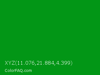 XYZ 11.076,21.884,4.399 Color is a dark green color and the nearest color is Islamic Green #009000. Hex code #029616 and RGB value is rgb(2,150,22). In RGB color space, this color is composed of 1% red, 59% green, 9% blue, In CMYK color space, this color is composed of 99% cyan, 0% magenta, 85% yellow , 41% black , In HSL color space, this color has a hue angle of 128° , 97% saturation and 30% lightness.