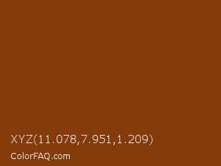 XYZ 11.078,7.951,1.209 Color is a dark orange color and the nearest color is Peru Tan #7f3a02. Hex code #843a09 and RGB value is rgb(132,58,9). In RGB color space, this color is composed of 52% red, 23% green, 4% blue, In CMYK color space, this color is composed of 0% cyan, 56% magenta, 93% yellow , 48% black , In HSL color space, this color has a hue angle of 24° , 87% saturation and 28% lightness.