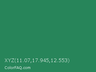 XYZ 11.07,17.945,12.553 Color is a normal green color and the nearest color is Eucalyptus #278a5b. Hex code #27855a and RGB value is rgb(39,133,90). In RGB color space, this color is composed of 15% red, 52% green, 35% blue, In CMYK color space, this color is composed of 71% cyan, 0% magenta, 32% yellow , 48% black , In HSL color space, this color has a hue angle of 153° , 55% saturation and 34% lightness.