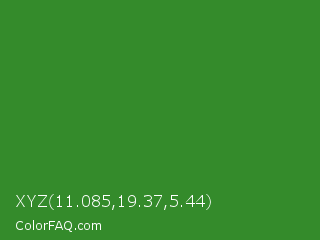 XYZ 11.085,19.37,5.44 Color is a normal green color and the nearest color is Forest Green #228b22. Hex code #348b2b and RGB value is rgb(52,139,43). In RGB color space, this color is composed of 20% red, 55% green, 17% blue, In CMYK color space, this color is composed of 63% cyan, 0% magenta, 69% yellow , 45% black , In HSL color space, this color has a hue angle of 114° , 53% saturation and 36% lightness.